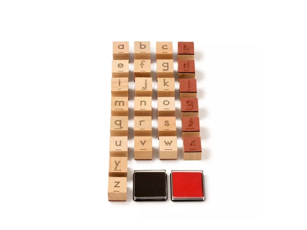 Set sadrži drvena slova za pečatiranje, jastučiće s tintom i kutiju za pohranu. Svako utisnuto slovo može se precrtati olovkom, čime se postupno trenira ruka za kasnije pisanje. Set potiče finu motoriku, koncentraciju i koordinaciju.