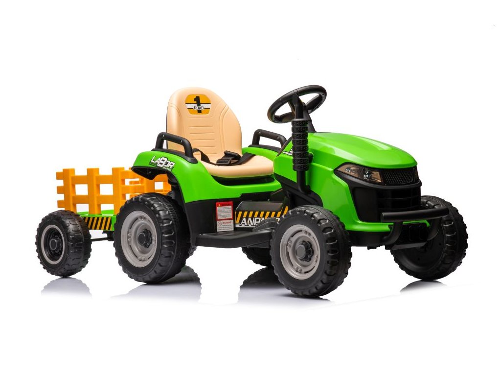 Dječji električni traktor s prikolicom ima dva vrlo snažna motora snage 45W i bateriju kapaciteta 12V 7Ah. Traktor je opremljen prednjim LED svjetlima i glazbenim panelom s Bluetooth ulazom. Maksimalna nosivost traktora je 30 kg.