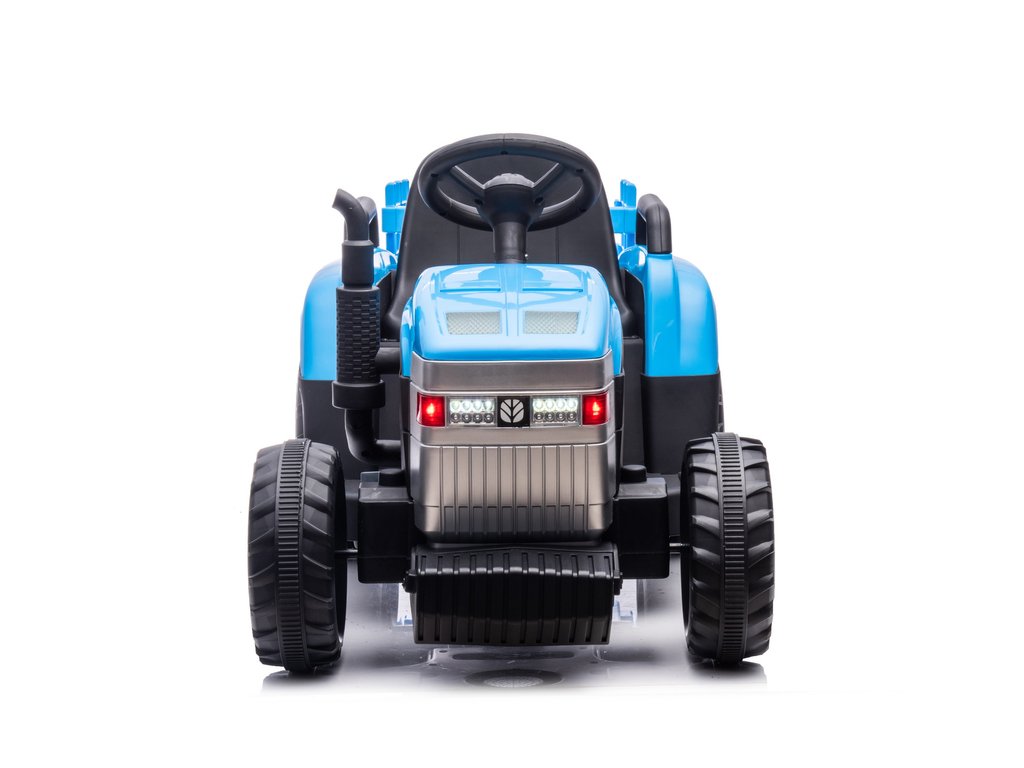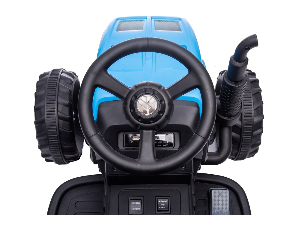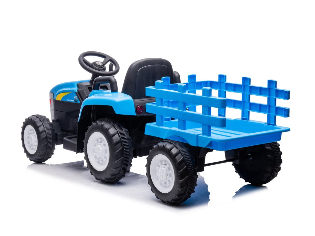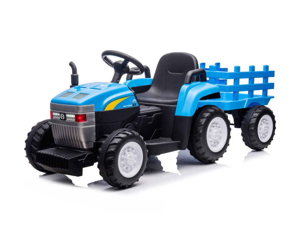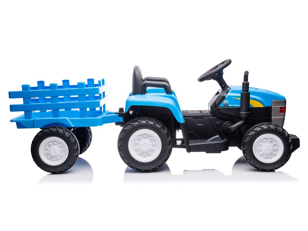 Dječji električni traktor s prikolicom New Holland ima dva motora snage 45W i bateriju kapaciteta 12V 4,5Ah. Traktor ima prednja i stražnja LED svjetla te glazbeni panel s ulazom za MP3, USB i SD karticu. Maksimalna nosivost traktora je 35 kg.