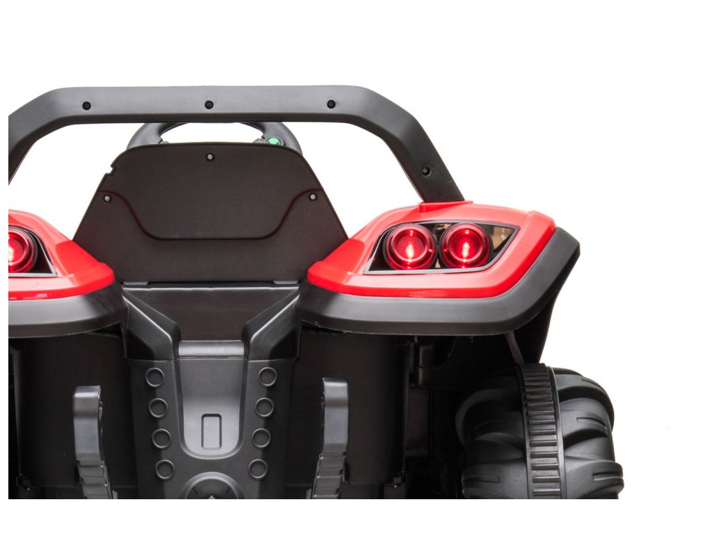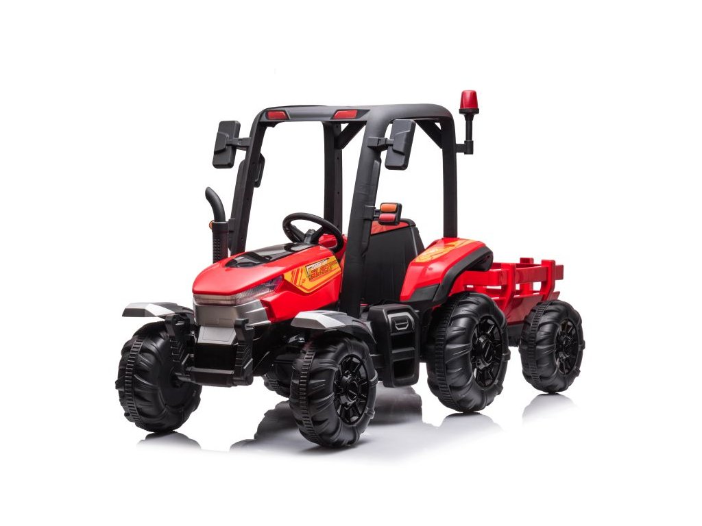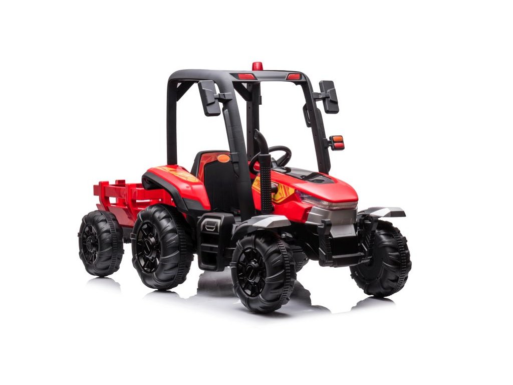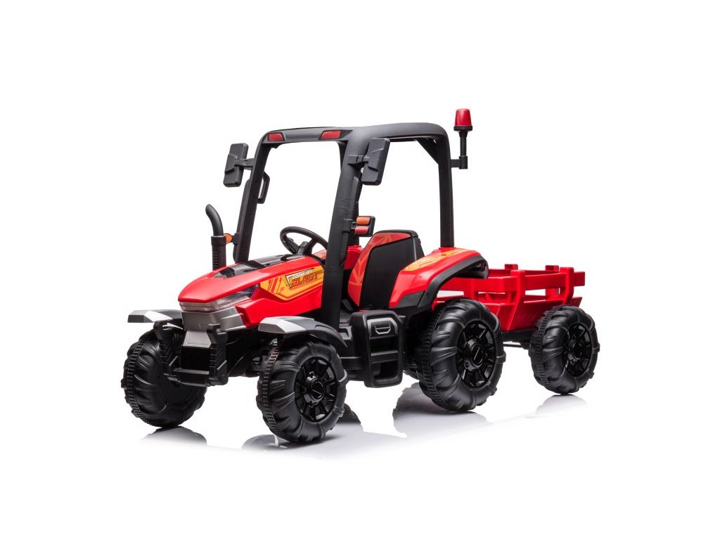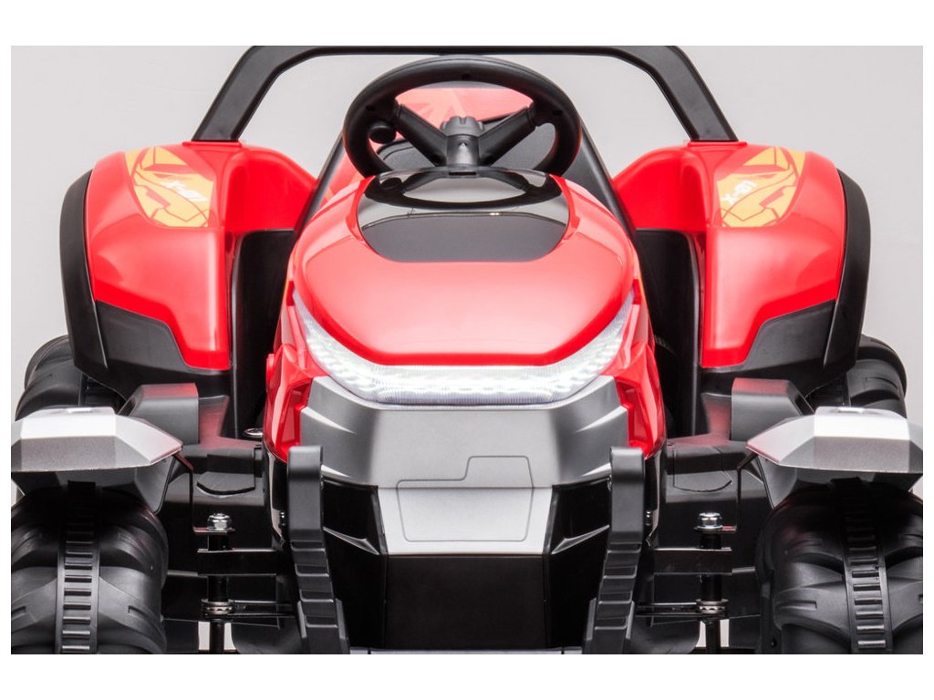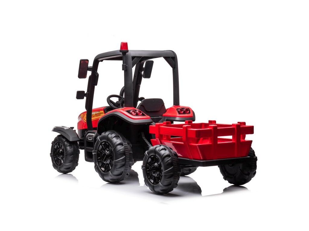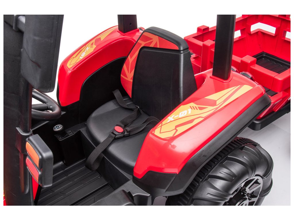 Traktor na akumulator s prikolicom BLT crveni opremljen je snažnim električnim motorom 2x200W i velikim EVA pjenastim gumama koje lako savladavaju neravan teren.