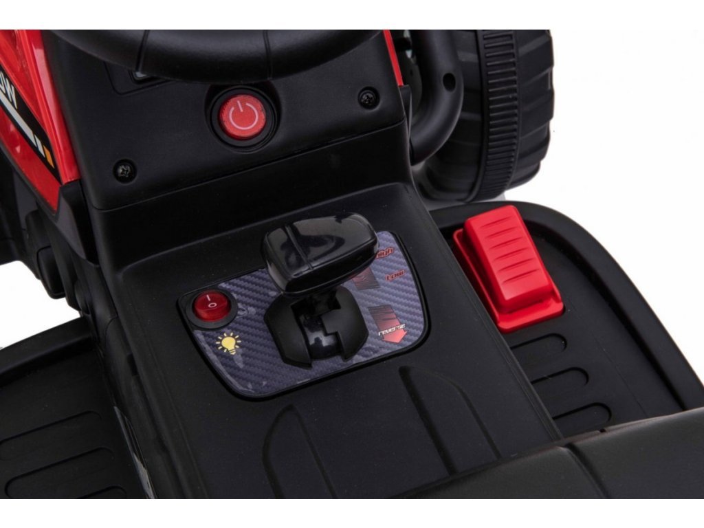Dječji traktor s prikolicom izgleda sjajno - sigurni smo da će mladi vozači imati isto mišljenje. Unutra se nalazi crno sjedalo, ispred njega je upravljač, kontrolne tipke i glazbeni panel s USB, MP3 i Bluetooth ulazom. Za pokretanje vozila dovoljno je pritisnuti tipku START.