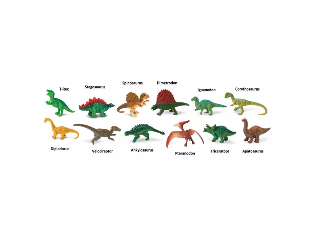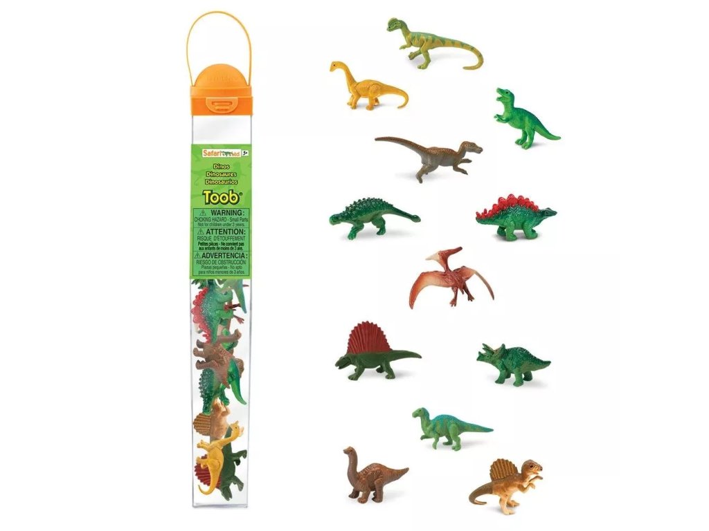 Kolekcija Safari Ltd. TOOBS predstavlja set ručno oslikanih minijaturnih replika životinja dizajniranih s naglaskom na vjernost i detalje. Tuba s dinosaurima sadrži 12 pretpovijesnih figurica prikladnih za učenje oblika i karakteristika vrsta; nazivi životinja često su navedeni na engleskom jeziku na trbuhu figurica.