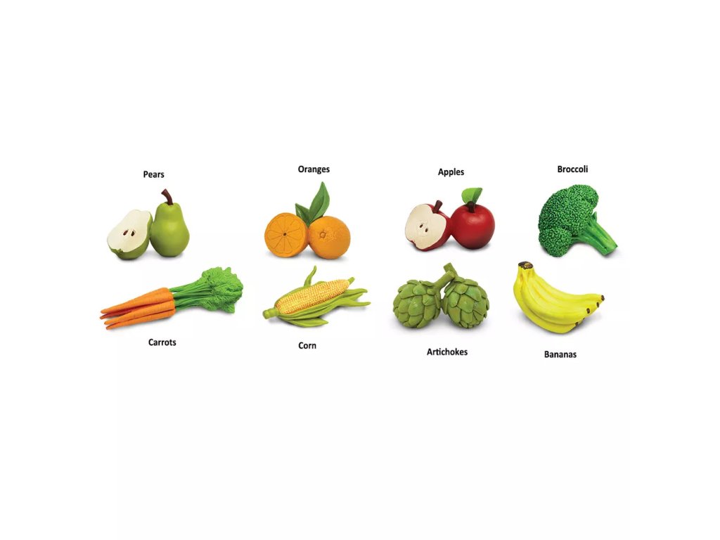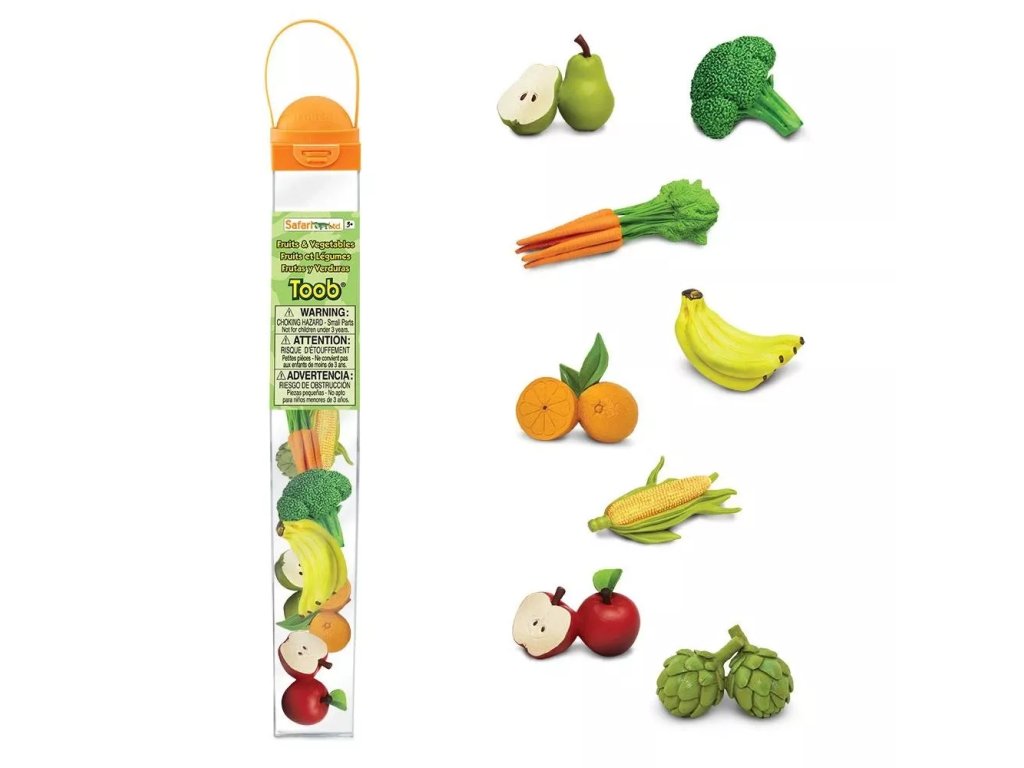Tuba sadrži osam ručno oslikanih modela voća i povrća u realnim bojama i s propraciranim detaljima. Riječ je o didaktičkom pomagalu prikladnom za razvijanje rječnika i prepoznavanje uobičajenih vrsta voća i povrća kod djece.