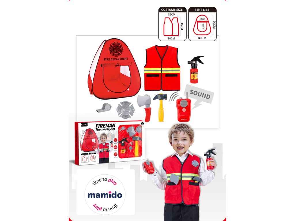 Paket uključuje crveni šator Fire Department, vatrogasni prsluk s reflektirajućim elementima i niz realističnih dodataka, poput vatrogasnog aparata, toki-vokija sa zvukom, sjekire, čekića, zviždaljke i bedža. Zahvaljujući tome, djeca mogu oponašati akcijske situacije i uživati u dugim satima zabave.