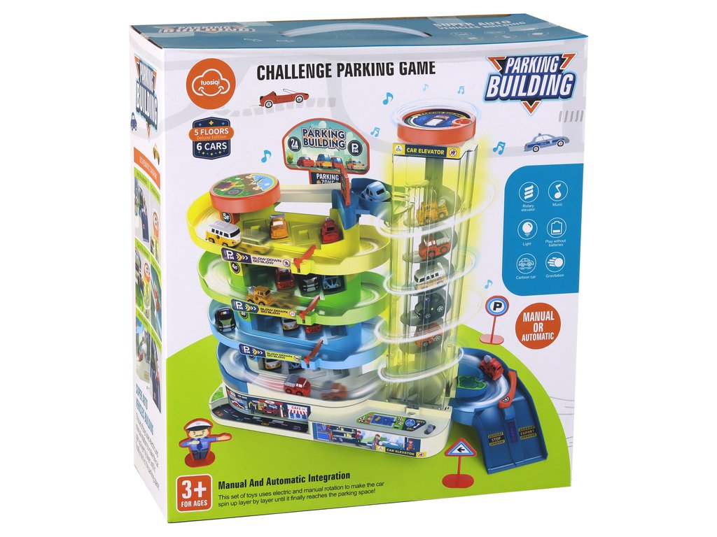 Višekatno parkiralište za autiće je igračka za male zaljubljenike u automobile i nudi sate kreativne zabave. Svaki od četiri kata parkirališta ima četiri parkirna mjesta, gdje dijete lako može parkirati priložene autiće. Jedinstvena značajka je dizalo koje omogućuje premještanje automobila između katova. Staza je opremljena svjetlosnim i zvučnim efektima.