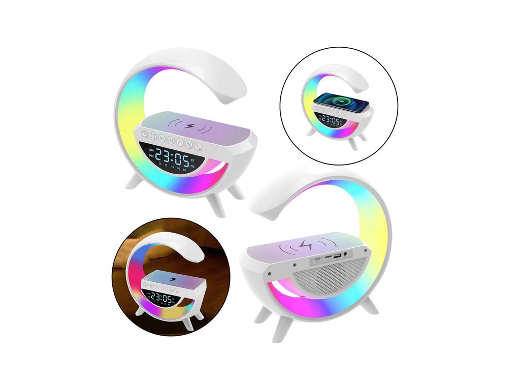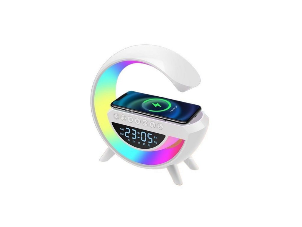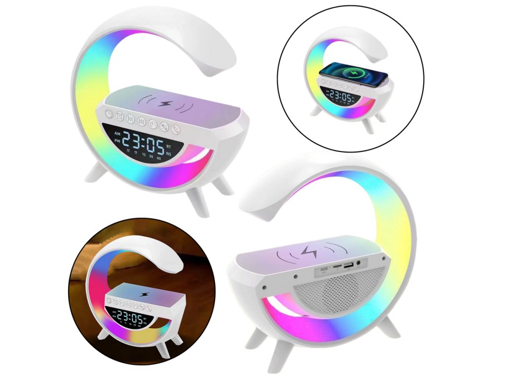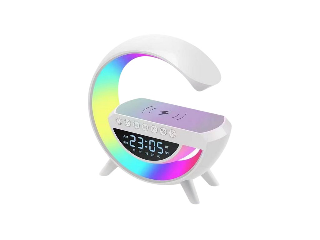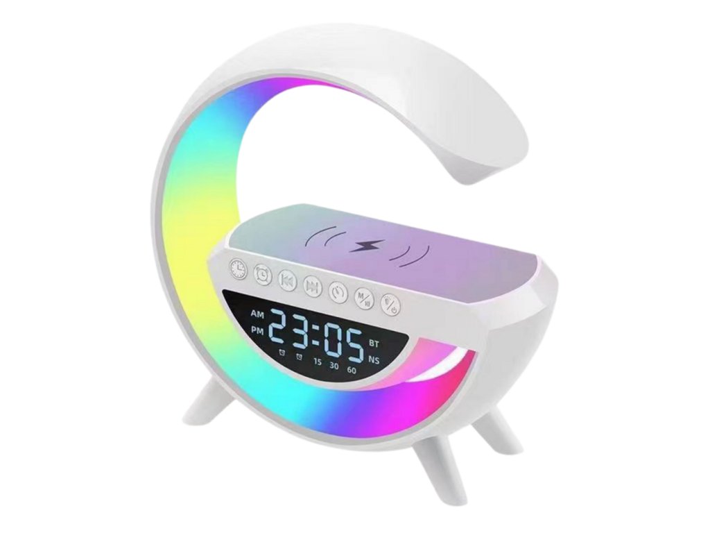 Moderna noćna lampa G63 svestran je uređaj koji se savršeno uklapa u svaku spavaću sobu, dječju sobu ili radnu sobu. Kombinira funkcije pametne lampe, budilice, zvučnog uređaja i indukcijskog punjača , pružajući praktičnost i funkcionalnost u jednom elegantnom uređaju. Zahvaljujući simulaciji izlaska sunca, buđenje je prirodnije i nježnije, što potiče bolje blagostanje od jutra. Mogućnost glatkog podešavanja svjetline svjetla i odabira različitih načina boja omogućuje vam prilagodbu atmosfere bilo kojoj situaciji - od opuštanja prije spavanja do buđenja ujutro.