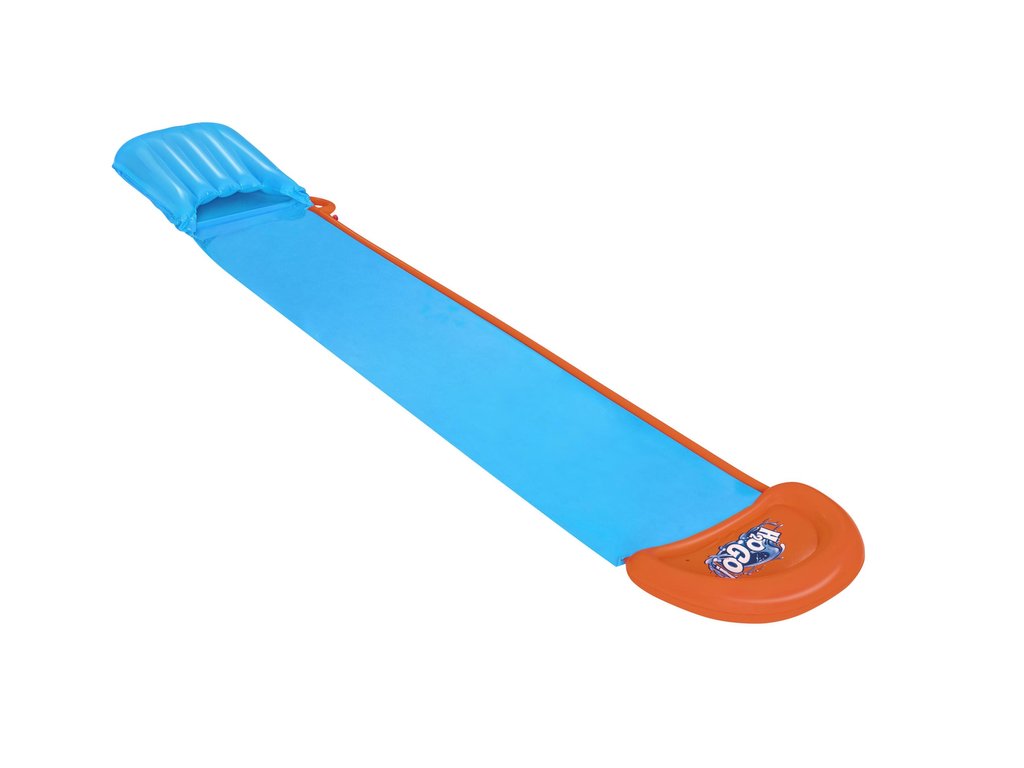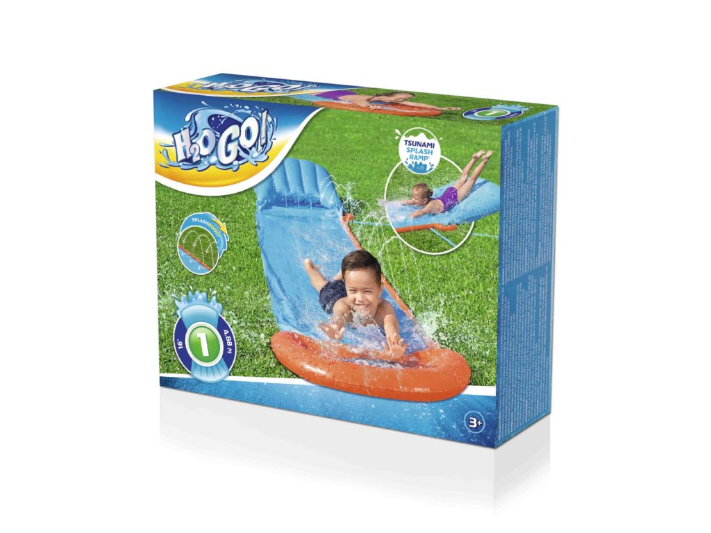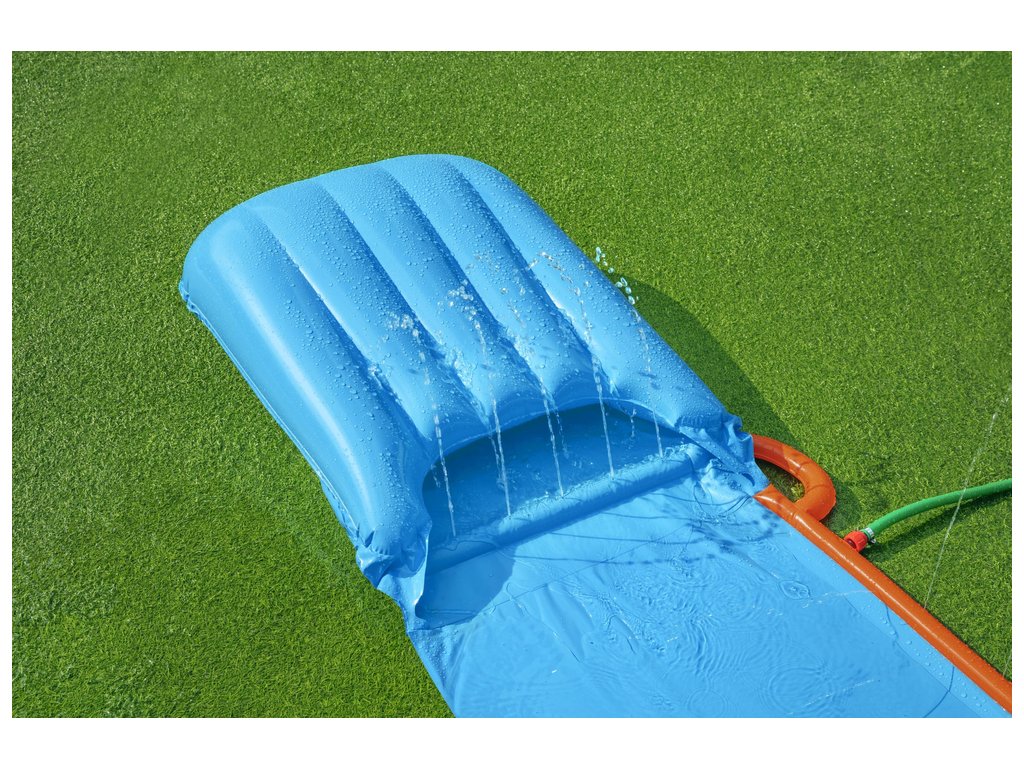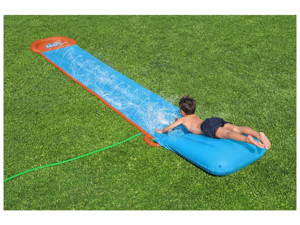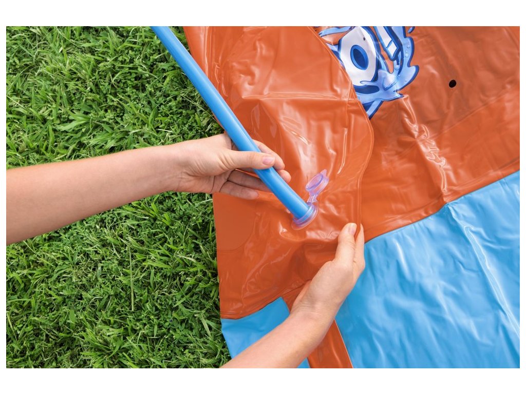 Dovoljno je postaviti tobogan, učvrstiti ga na zemlju i priključiti vrtno crijevo. Zahvaljujući posebnim sigurnosnim elementima, koji su uključeni u set, tobogan se neće pomaknuti. Priložene dvije na napuhavanje lame poboljšavaju kretanje niz tobogan. Pobjeđuje onaj tko prvi stigne do cilja.