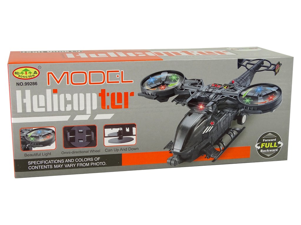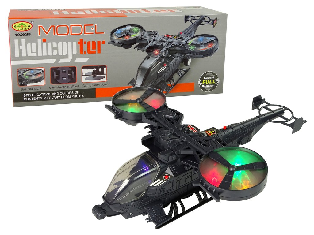Vojni helikopter omogućuje izvrsnu zabavu, obogaćuje igru, zadovoljava ljubitelje vojne tematike i avijacije. Ima velika rotirajuća krila koja svijetle različitim bojama. Svjetlosni efekti popraćeni su i zvučnim efektima, poput zvuka uzleta i pucnjave. Ispod helikoptera su montirani kotačići koji omogućuju njegovo kretanje.